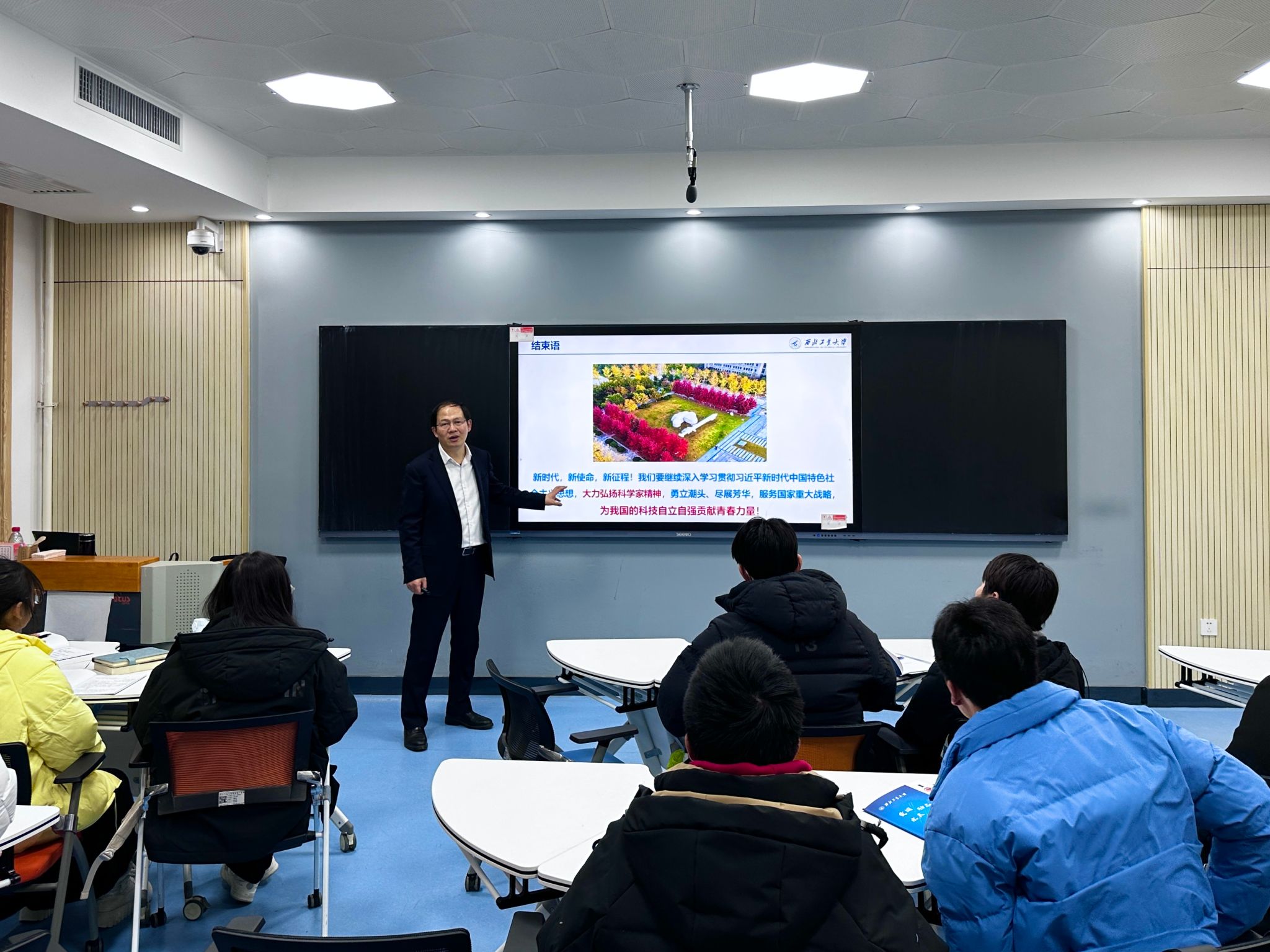 随后,他围绕“传承‘总师育人文化’,努力成为拔尖创新人才”,结合“愿意去、留得住、干得好”的“西工大现象”和“低调务实、兼收并蓄,厚积薄发,为国铸剑”的总师特质内涵,为同学们全面解读“总师育人文化”,并通过介绍从西工大走出去的总师队伍、杰出校友们的先进事迹,引领大家涵养家国情怀,树立报国之志。