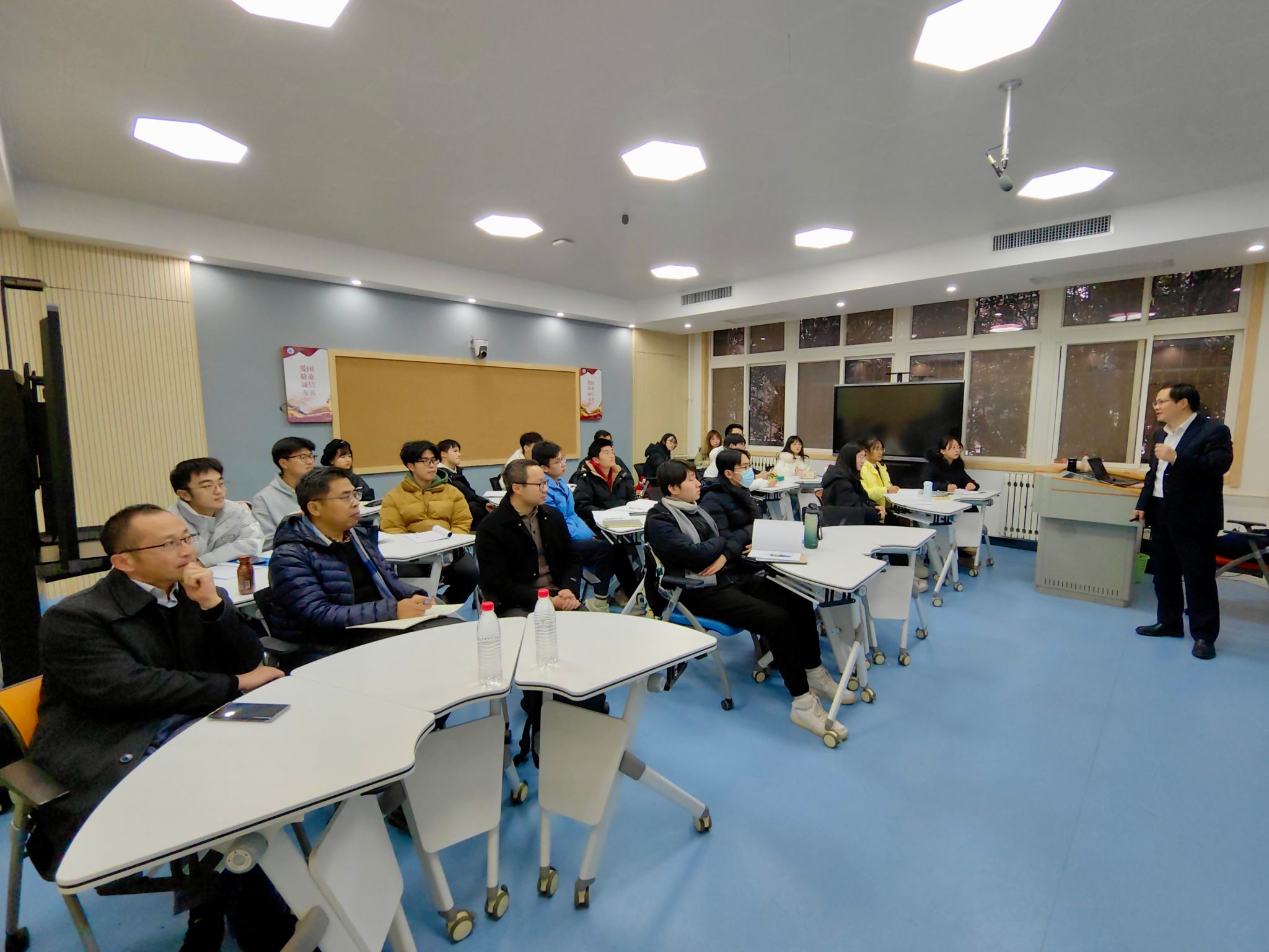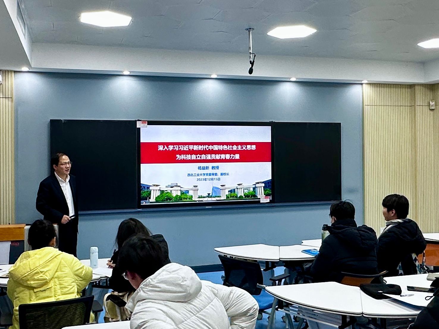 12月15日下午,必赢国际437官网特别邀请必赢国际437官网党委常委、副校长杨益新教授为学院师生讲授主题为《深入学习习近平新时代中国特色社会主义思想,为科技自立自强贡献青春力量》的思政课,必赢国际437官网党委书记孙华强、党委副书记王银涛、辅导员郭兵勇与学院大三年级预备党员共同聆听本次思政课。