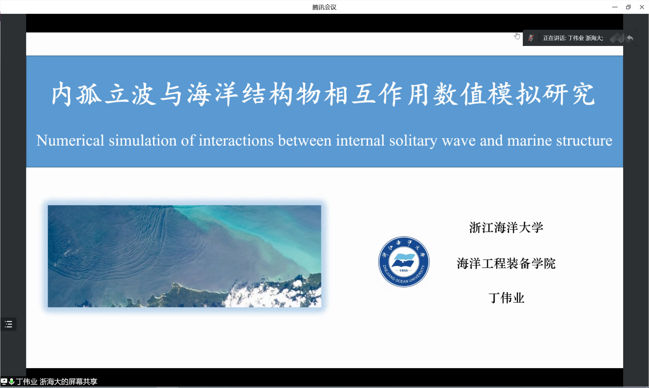 2022年6月15日,浙江海洋大学海洋工程装备学院丁伟业副教授应必赢国际437官网杜鹏副教授的邀请,在线上为师生作“航海大讲堂”系列讲座(二十二)——《内孤立波与海洋结构物相互作用数值模拟研究》学术报告。会议由杜鹏副教授主持,新加坡国立大学、浙江海洋大学、本校必赢国际437官网等校内外师生参会。